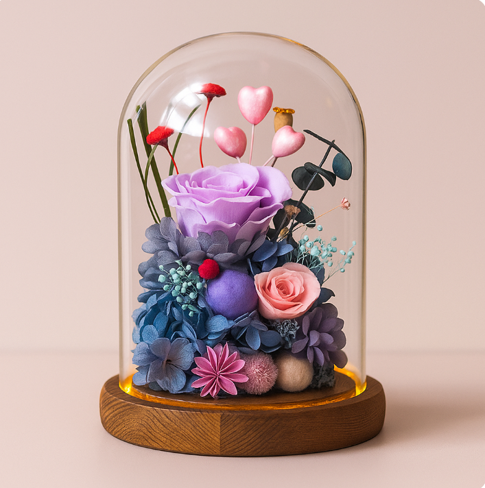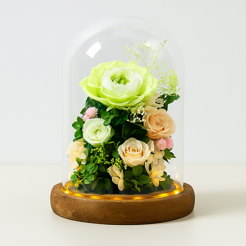 以四種花色搭配經典玻璃罩,傳遞不凋的祝福。每一款花藝作品皆由專業花藝師手作呈現,為您的心意增添儀式感。