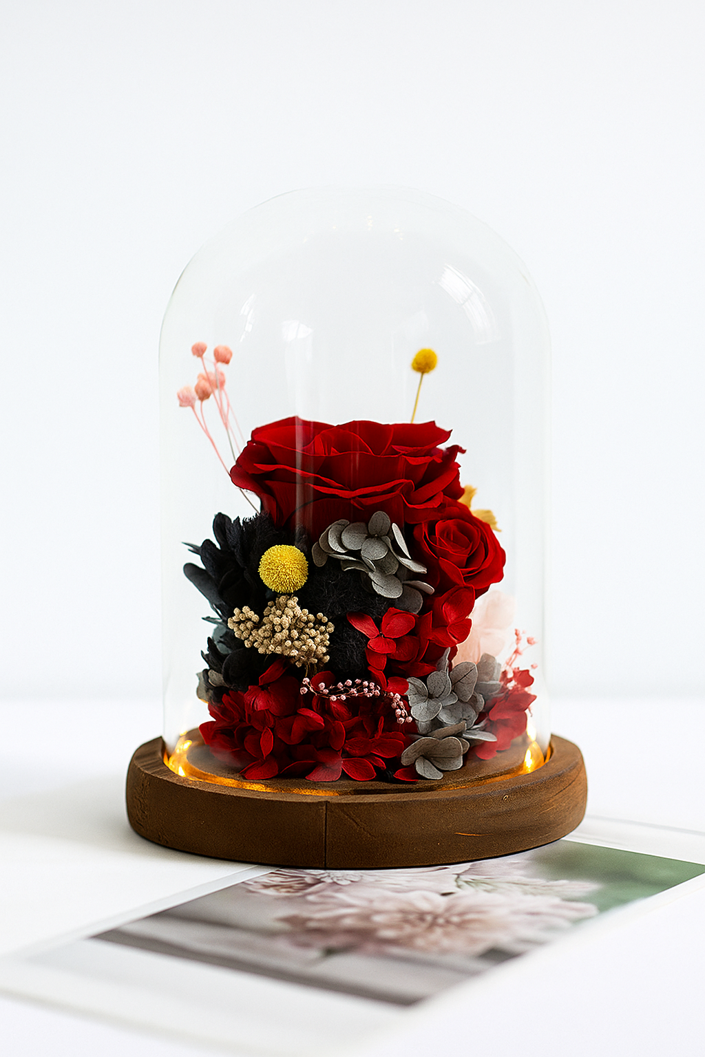 玻璃罩設計防塵防潮,搭配小燈串柔光,無論白天或夜晚都是桌面最動人的焦點。